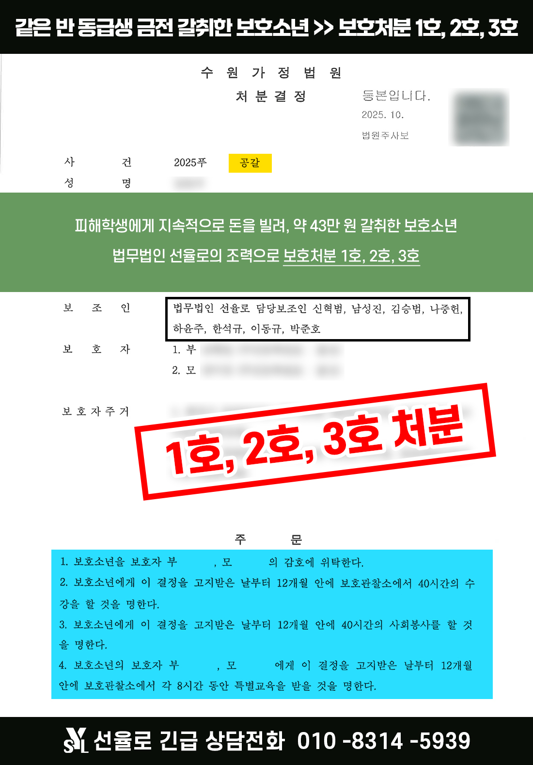 수원미성년자공갈변호사 | 같은 반 동급생 금전 갈취한 보호소년 사례 (2025.10)
