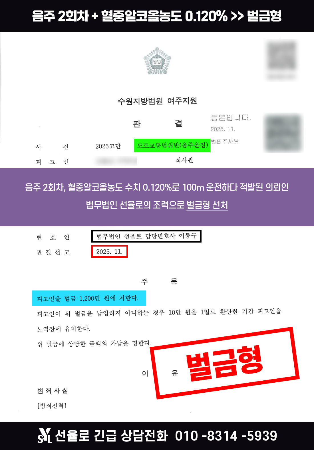 여주음주운전재범변호사 | 음주 2회차, 0.120% 수치로 약 100m 운전하다가 적발된 사례 (2025.11)