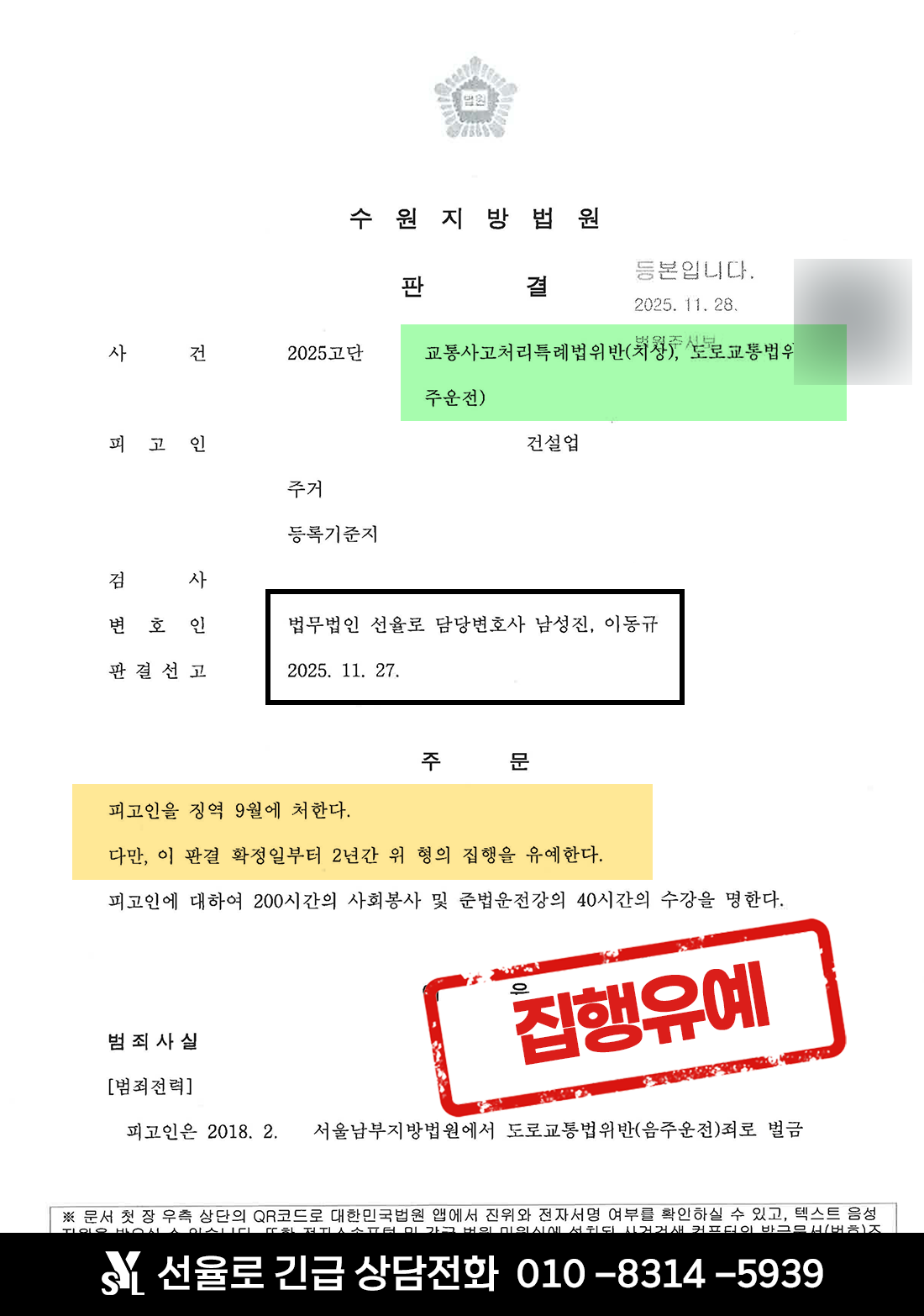 이러한 음주운전교통사고변호사의 조력을 통해 의뢰인은 실형이 아닌 집행유예 판결을 받을 수 있었습니다. 혈중알코올농도 0.128%의 고수치 음주운전, 장거리 주행, 인적 피해 발생, 과거 음주운전 전력 등 불리한 사정이 다수 존재하였음에도 불구하고, 음주운전교통사고변호사의 체계적인 대응으로 선처를 이끌어낸 사례입니다.