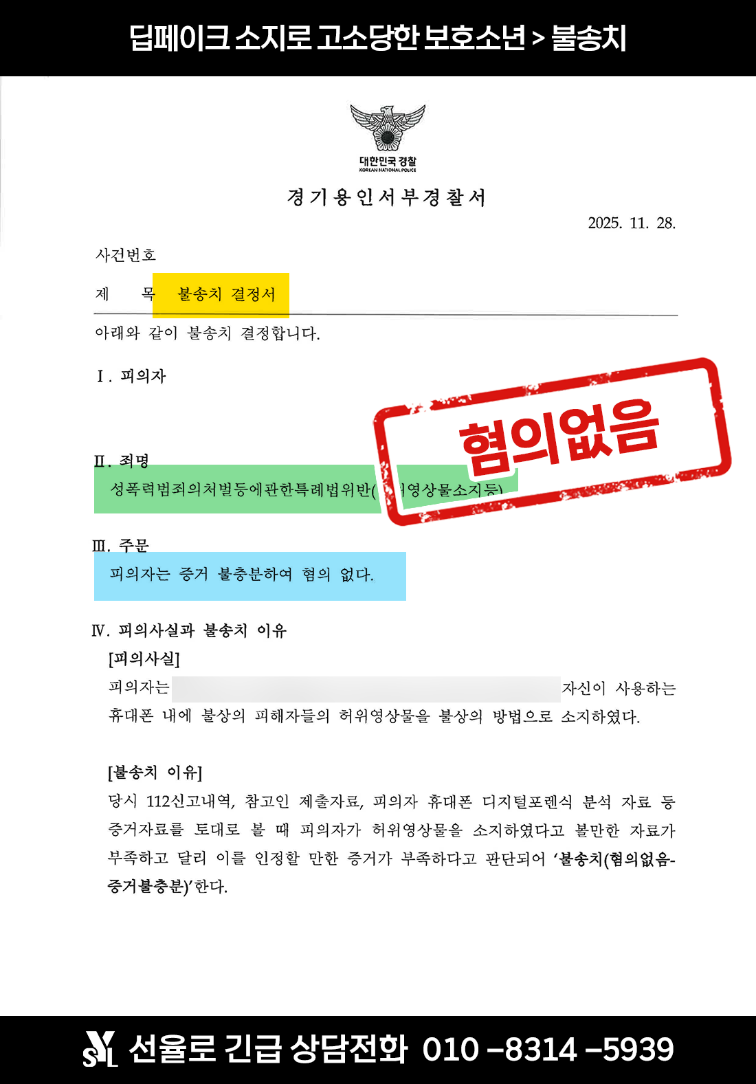 본 사건은 SNS 만남 이후 제3자가 개입하여 딥페이크 범죄를 빌미로 금전을 요구하며 협박한 사안으로, 사실관계와 객관적 자료를 체계적으로 소명함으로써 보호소년에 대한 형사 책임 없이 사건을 종결할 수 있었던 사례입니다.