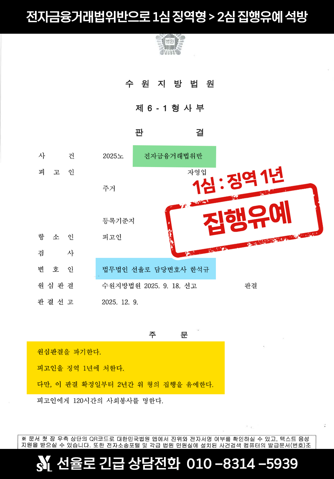 그 결과 항소심 재판부는 1심 판결을 변경하여 의뢰인에게 집행유예 판결을 선고하였고, 이에 따라 의뢰인은 석방될 수 있었습니다. 본 사건은 전자금융거래법 위반으로 실형이 선고되었던 사안에서, 수원전자금융거래법위반변호사와의 항소심을 통해 양형 사유를 충실히 소명함으로써 집행유예로 감형을 이끌어낸 사례입니다.