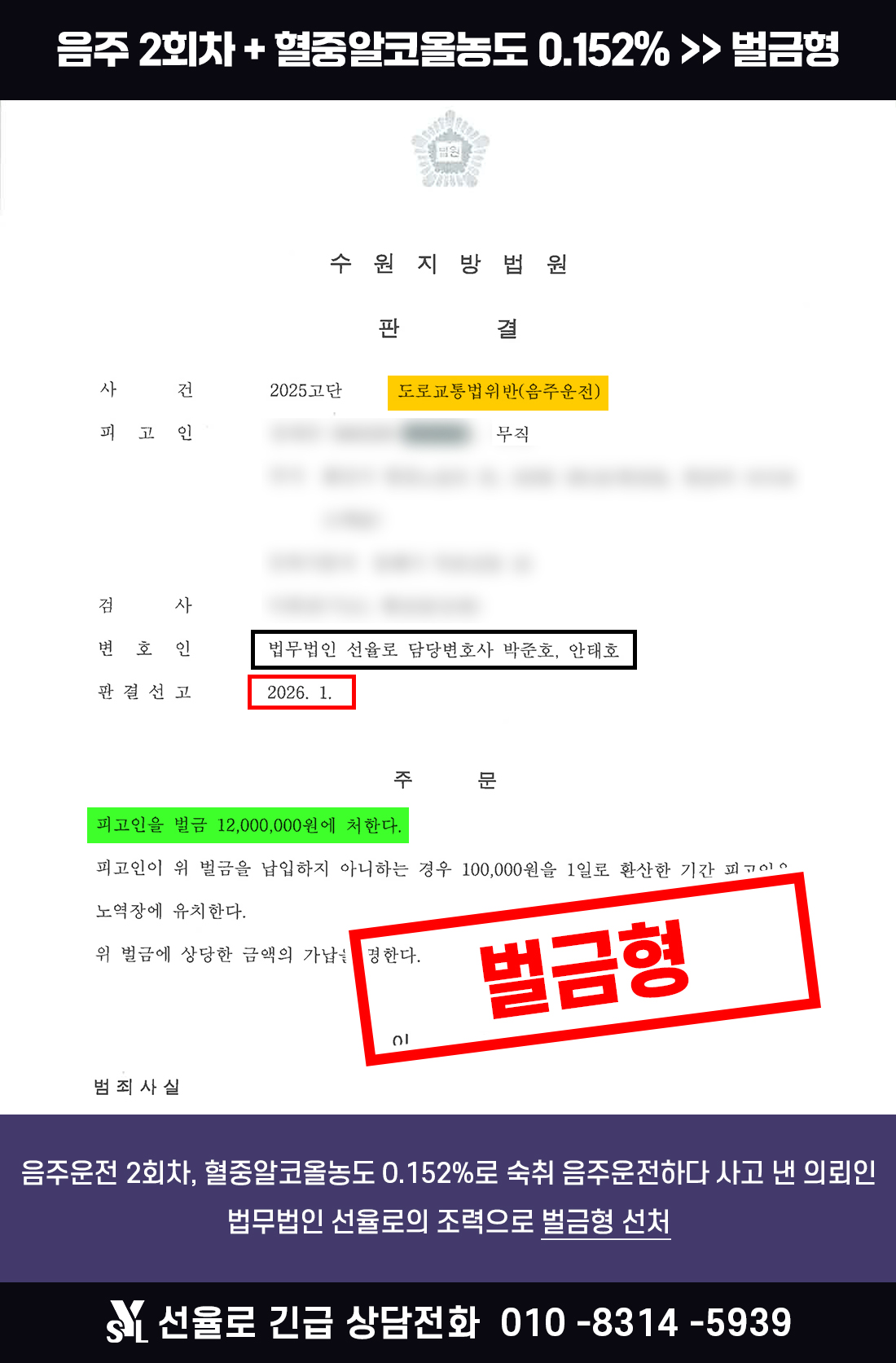 수원음주운전전문변호사 | 음주 2회차, 0.152% 수치로 숙취 음주운전하다 사고낸 의뢰인 사례 (2026.01)