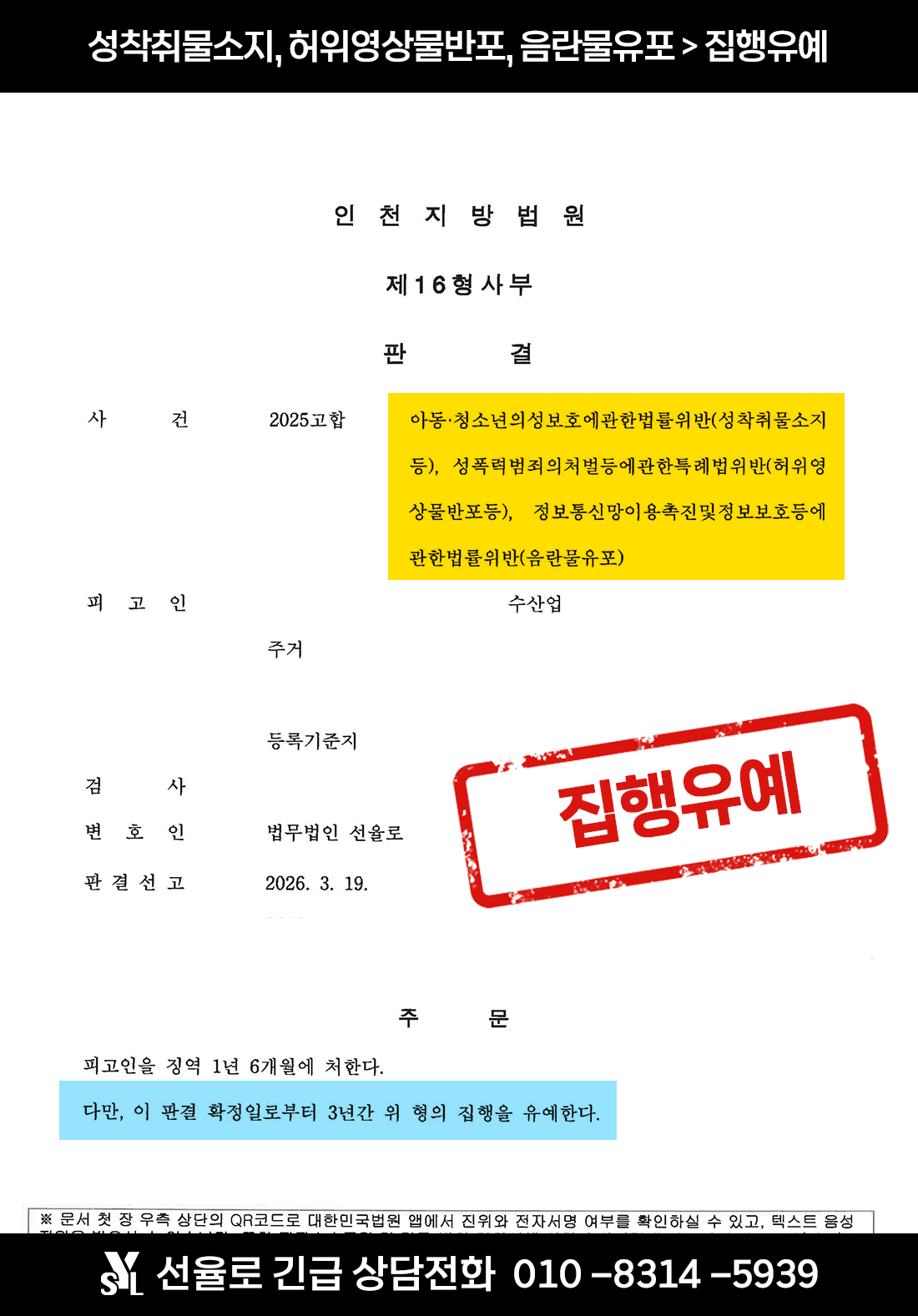 본 사건은 허위영상물 제작·유포 및 아동·청소년 성착취물 소지 등 중대한 디지털 성범죄가 복합적으로 문제 된 사안이었음에도 불구하고, 화성아청법위반변호사의 조력을 통해 진지한 반성과 가족 부양 사정 등이 참작되어 실형을 면할 수 있었던 사례입니다.