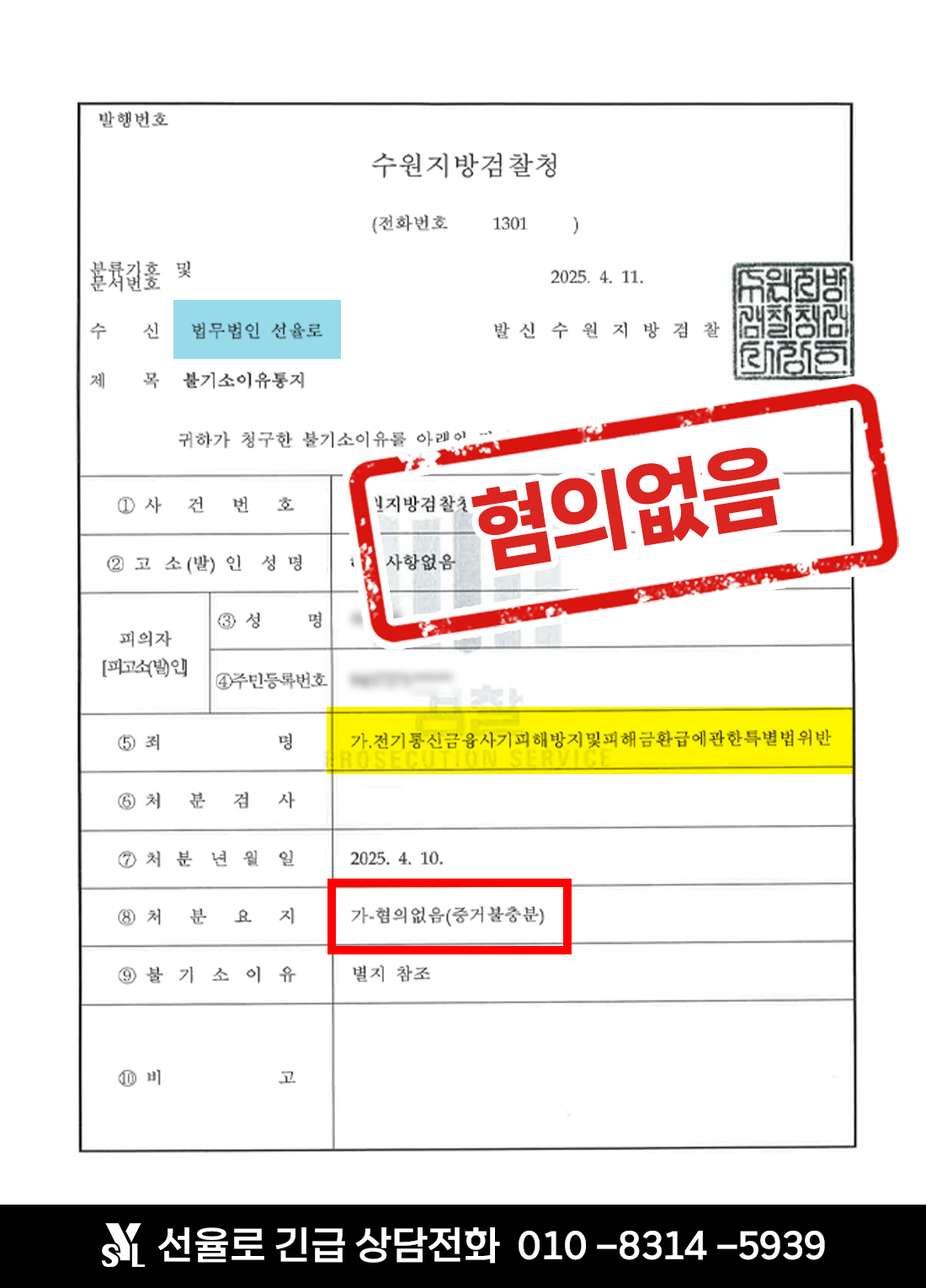 ▶ 선율로 실제 성공사례 - 전기통신금융사기피해방지및피해금환급에관한특별법위반 > 불기소(혐의없음)